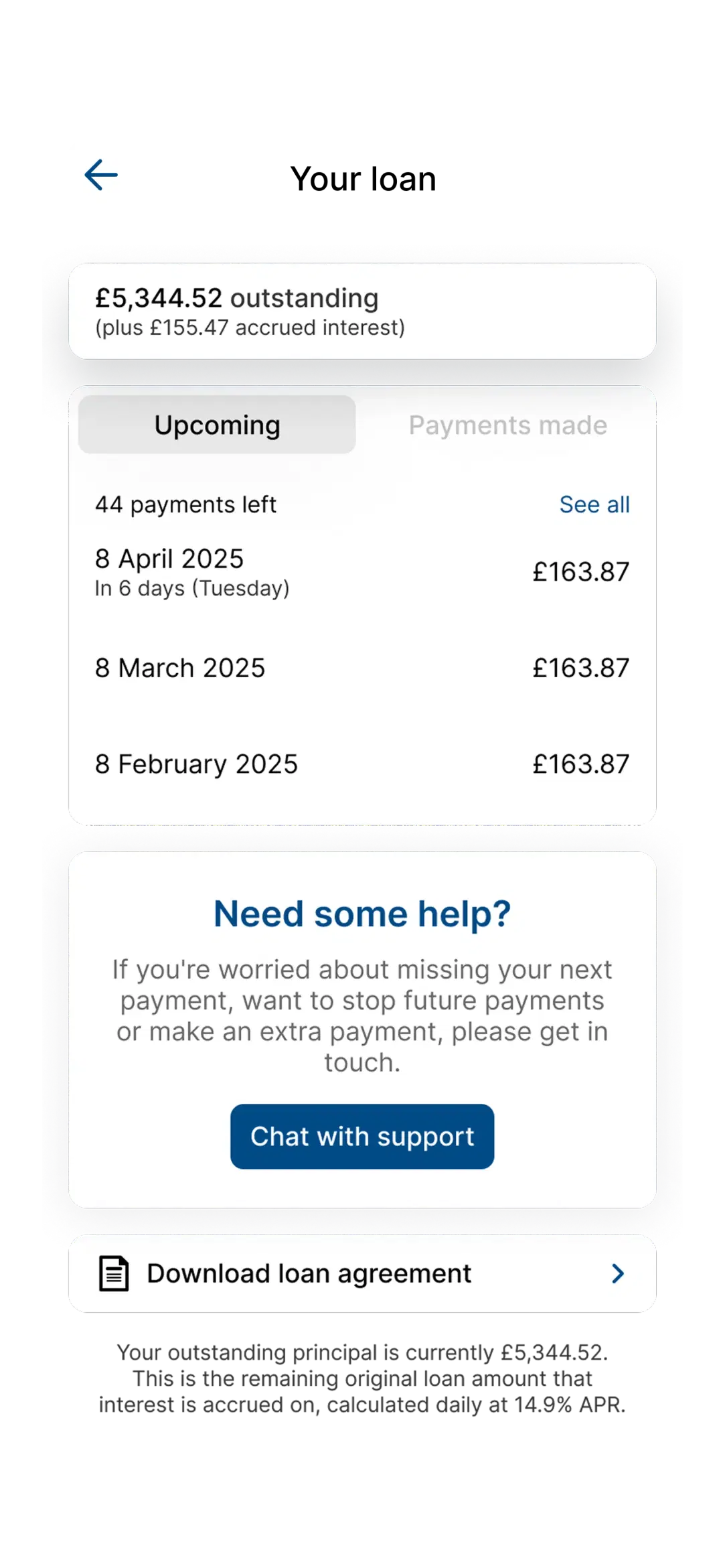 So, if you need support with your loan, you can speak to our friendly Customer Service team over the phone or message them on live chat through the app. They’re here to help.